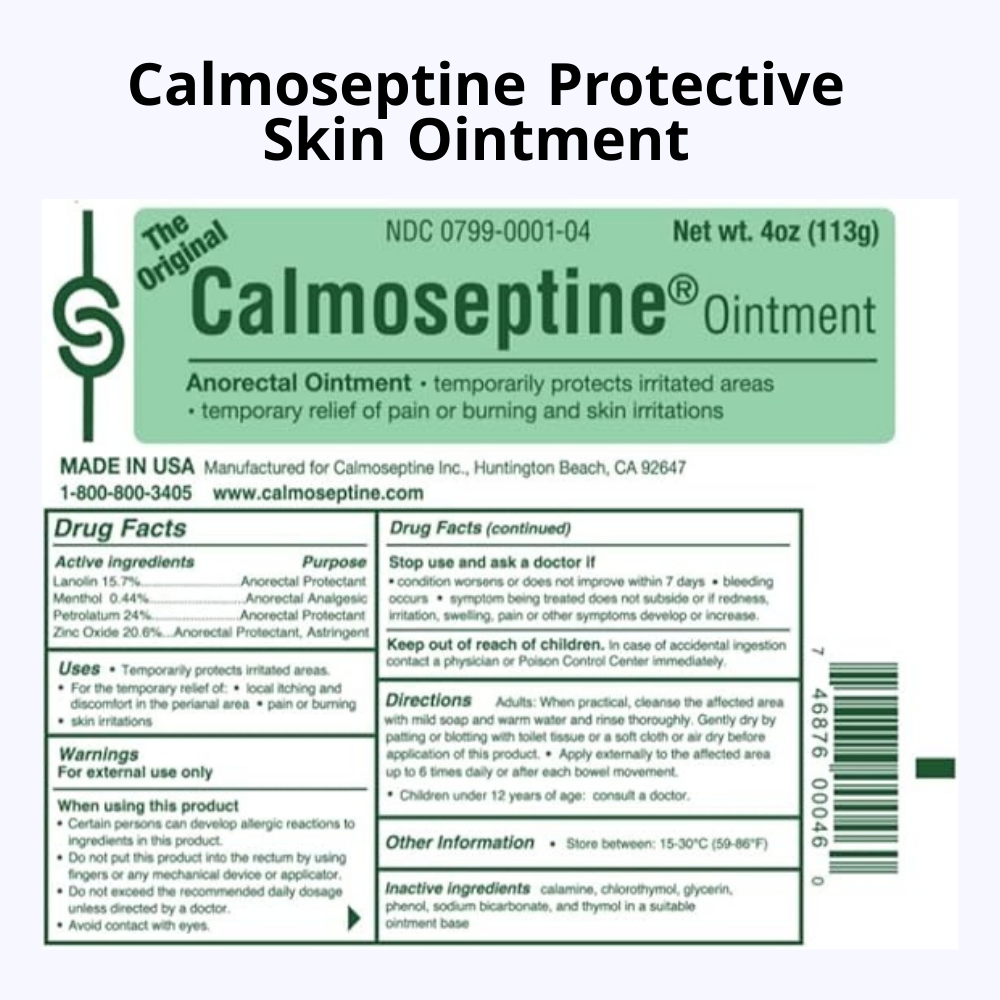 المكونات الفعالة: المنثول (0.44%) (مسكن خارجي، مطهر للإسعافات الأولية)، أكسيد الزنك (20.625%) (واقي الجلد/حاجز الرطوبة) المكونات غير النشطة: كالامين، كلوروثيمول، جلسرين، لانولين، فينول، بيكربونات الصوديوم (صودا الخبز)، ثيمول